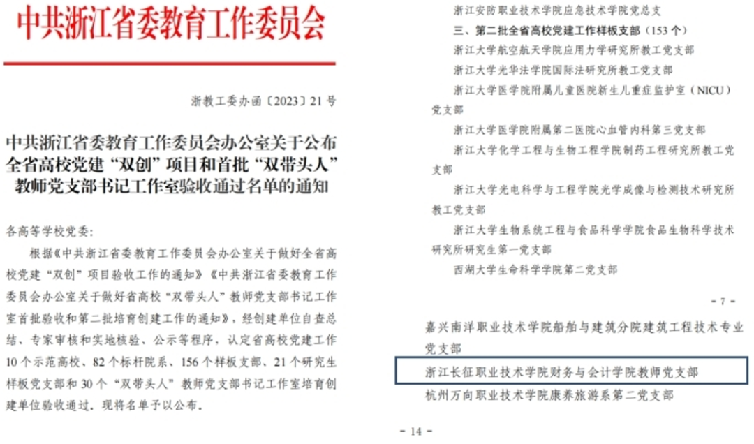 支部通过落实支部建设“1345”建设规划,取得了显著建设成果,获评校级先进基层组织,并于2023年7月顺利通过浙江省样板党支部的建设验收,助力大数据与会计、统计与会计核算两个专业获批为“十三五”省级特色专业、“十四五”校级特色专业,实现了党建和专业建设的双丰收。